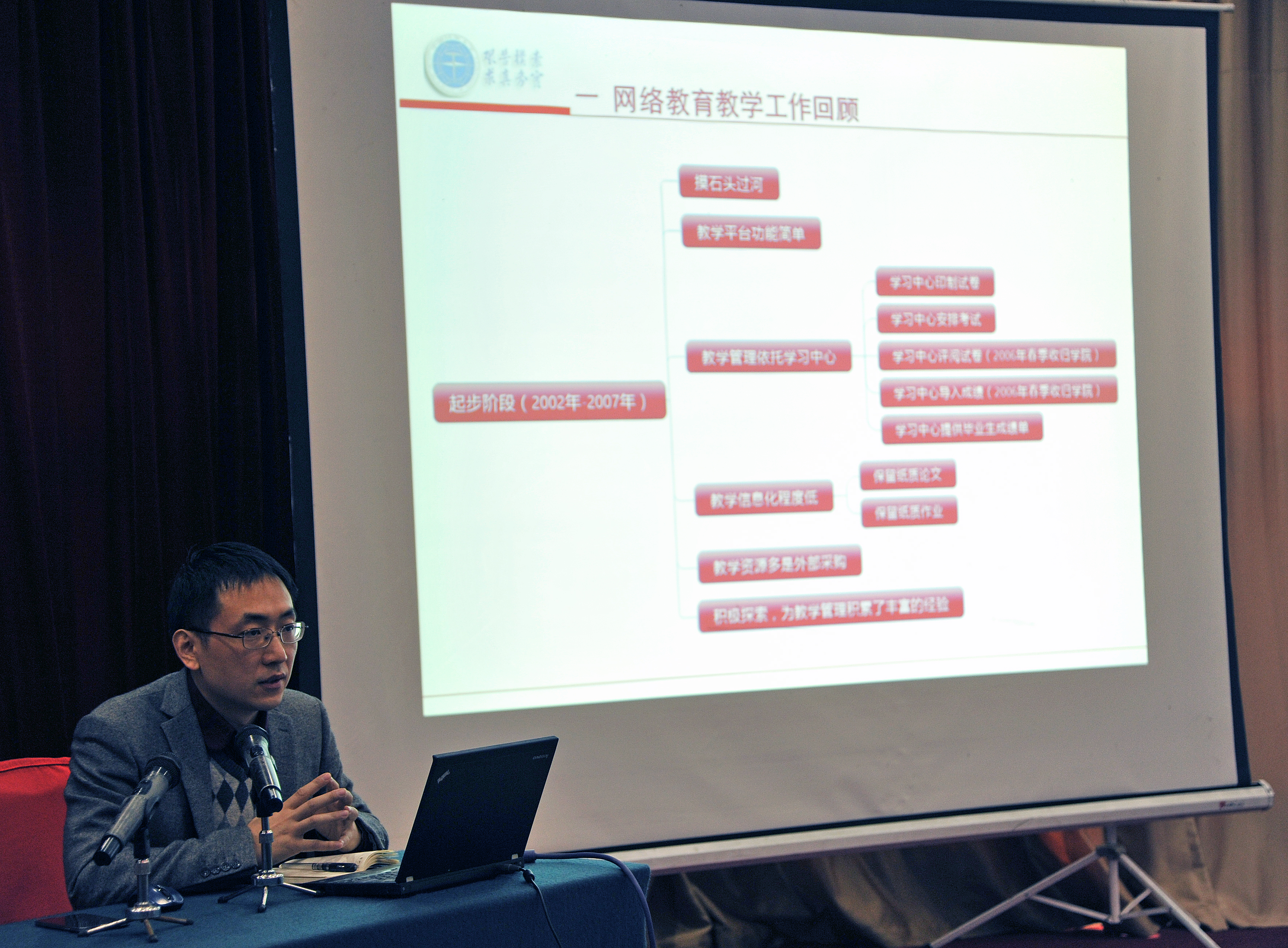 技术支持部主任蒋凌雁老师围绕2015年技术部的主要工作,对教学管理平台和新的学习平台在使用过程中出现一些问题作了总结和分析,进一步介绍了今后的工作安排,提出了与中心相互配合做好技术支持工作的建议。