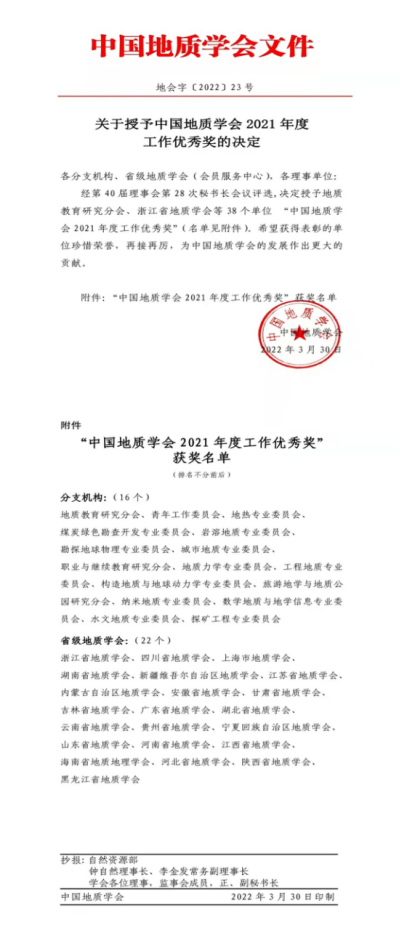 3月30日,中国地质学会召开各分支机构和省级学会秘书长线上会议,中国地质学会2021年度工作优秀奖评选结果揭晓(地会字[2022]23号),挂靠公司的中国地质学会职业与继续教育研究分会在众多分支机构中脱颖而出,被授予“2021年度工作优秀奖”,分会已连续两年获得此项荣誉。