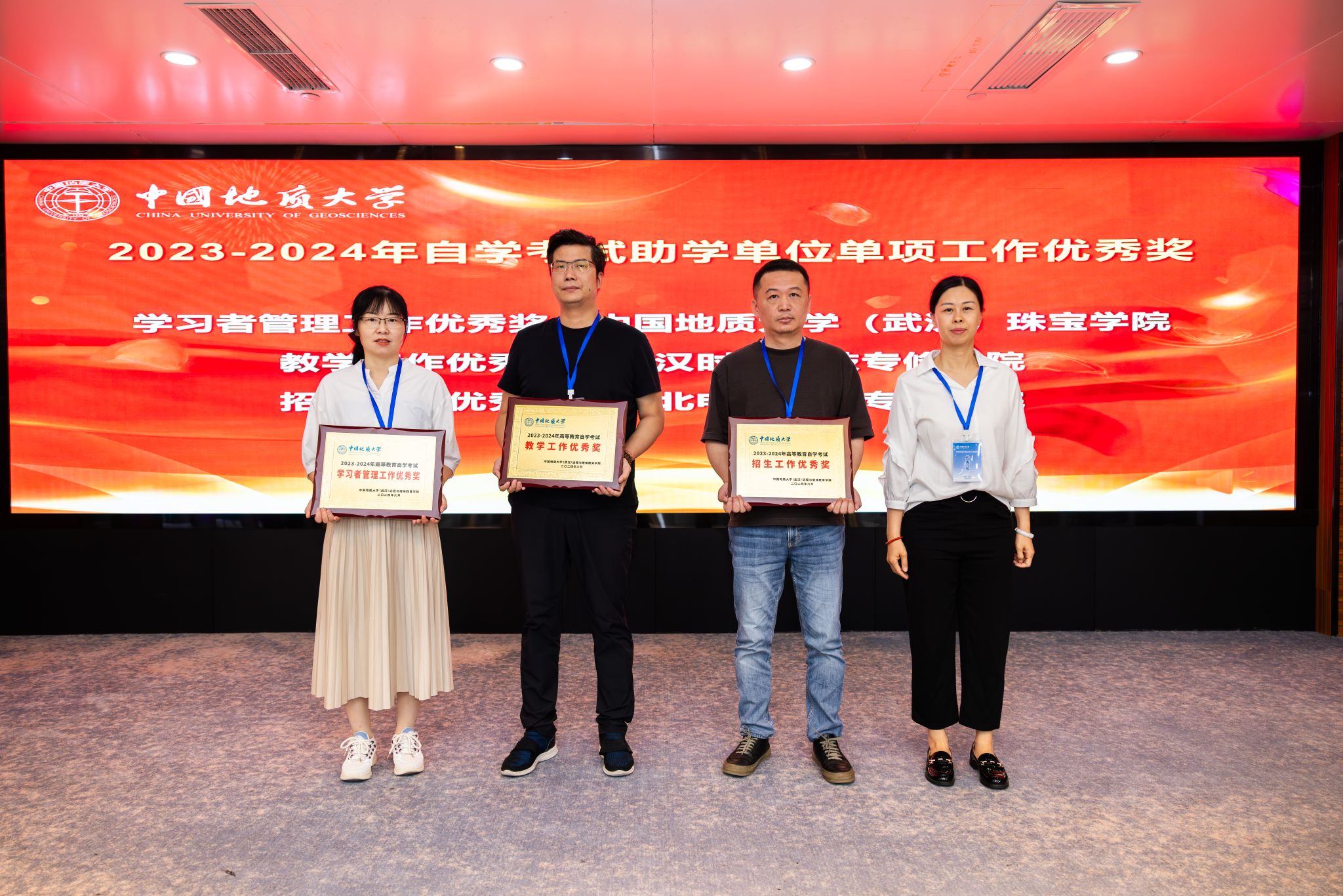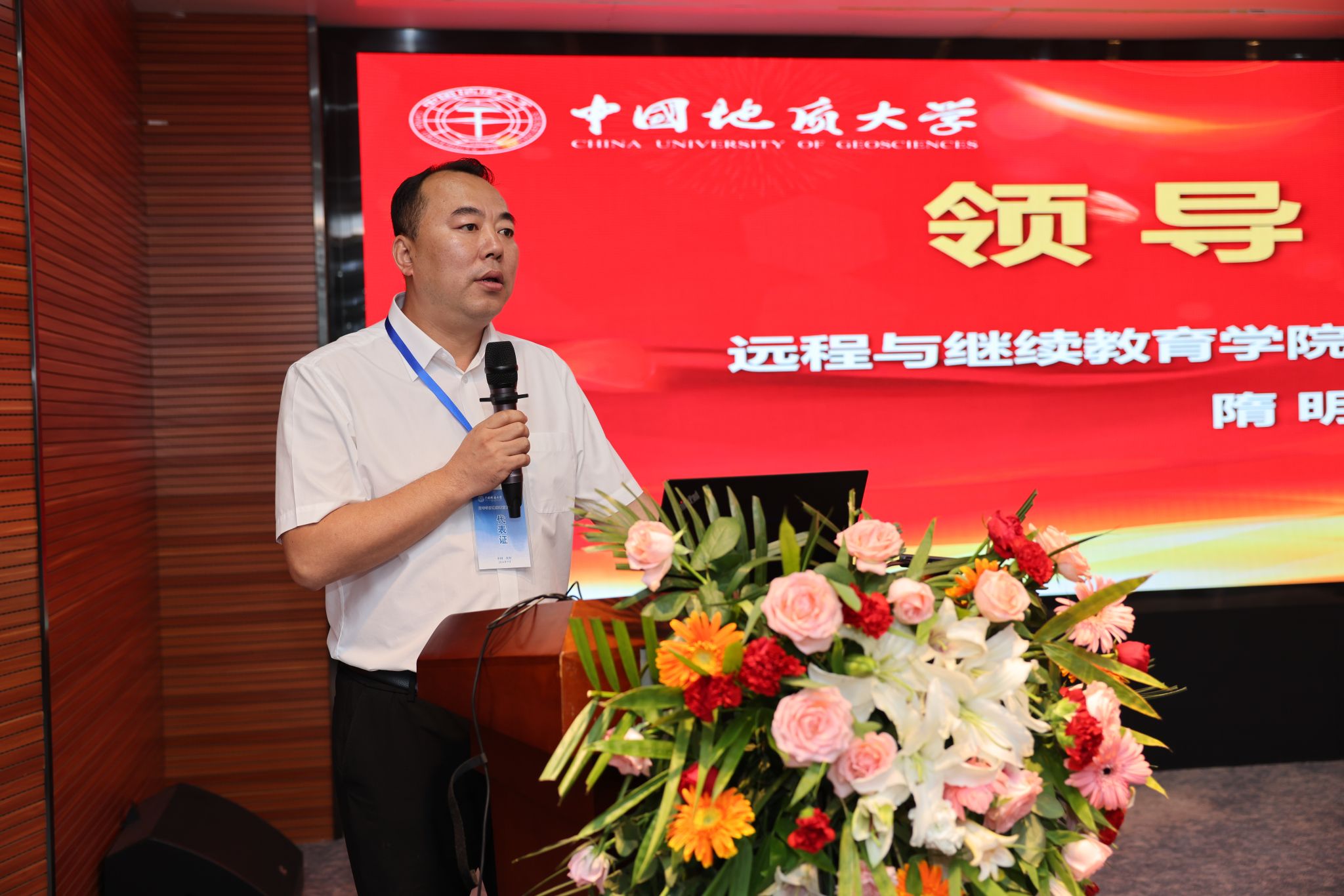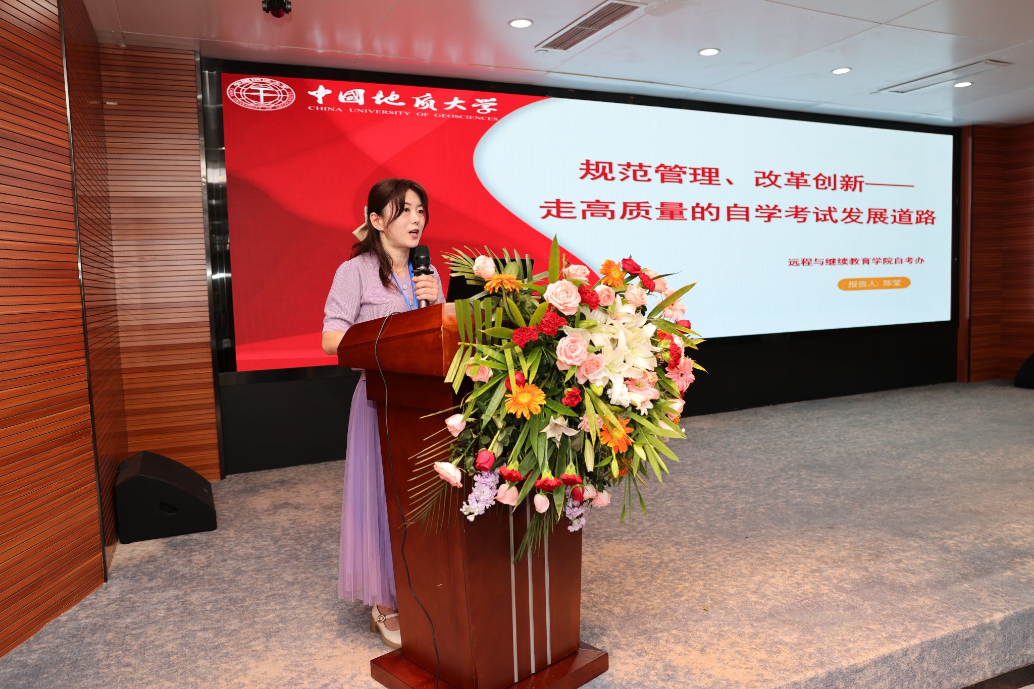 招生与站点管理部主任胡志毅、教学管理部主任刘晓平、自学考试办公室主任陈莹分别作校外教学点建设和招生管理、地大特色高等学历继续公司产品新体系、高质量自学考试发展道路工作报告。