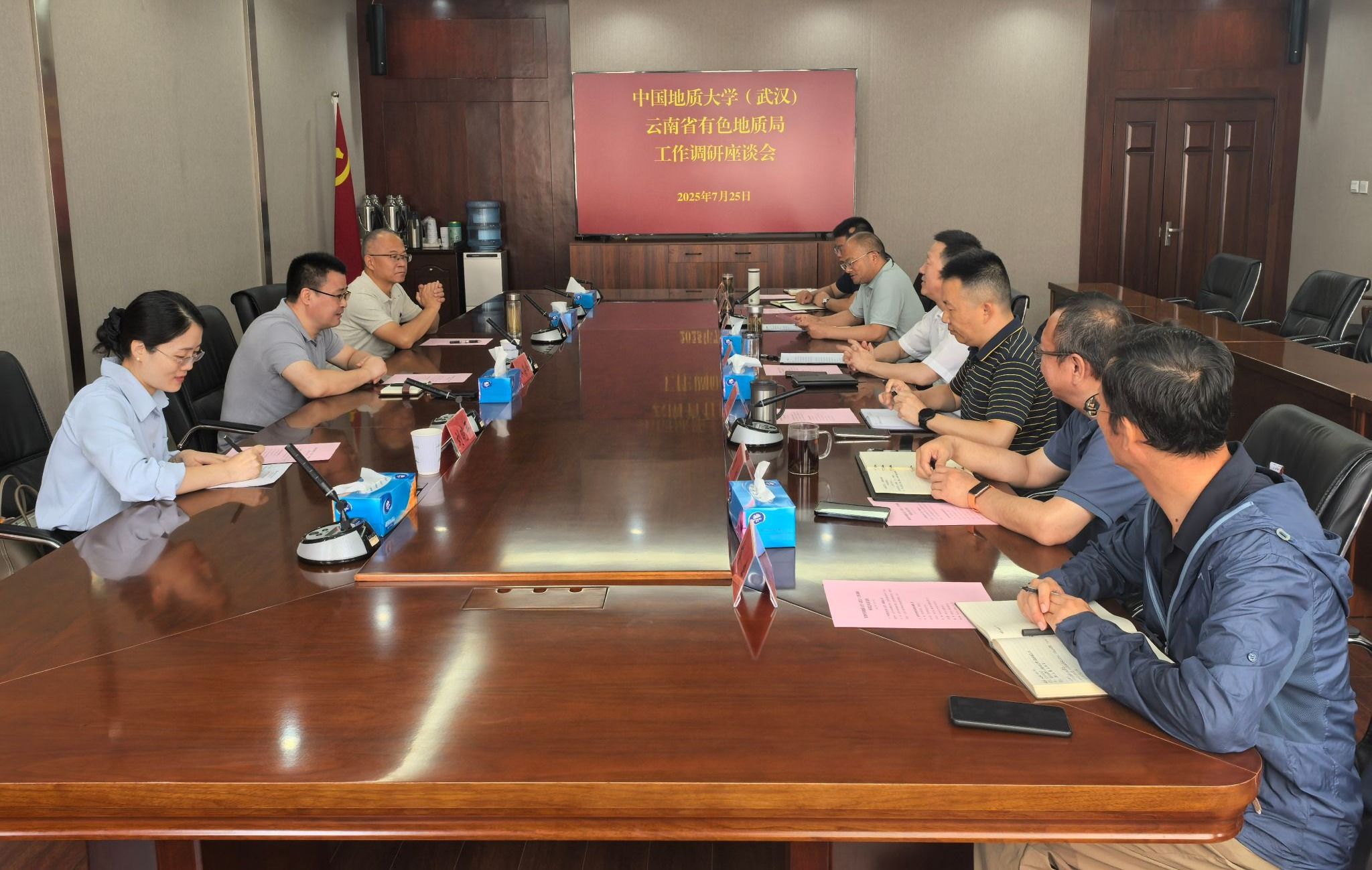7月25日,邬海峰经理、王兴副经理一行赴云南省有色地质局走访调研。云南省有色地质局党委委员、副局长李福出席座谈会,发展规划处、劳动人事处、科技与对外合作处、安全环境处等处室负责人及相关同志参加交流。