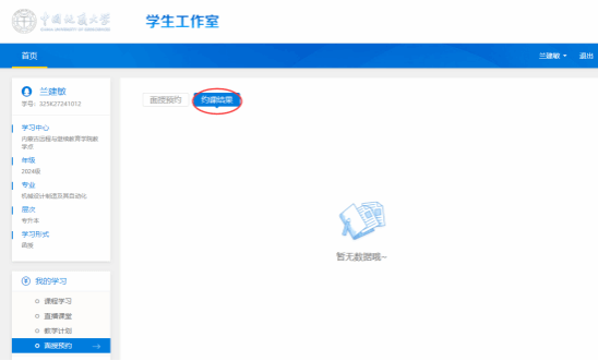 1.登录“学生工作室”,在左侧功能列表内点击“面授预约”。