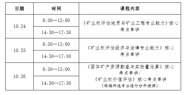 此次培训共计3天。培训课程依照考试科目设置,包括《矿业权评估地质与矿业工程专业能力》《矿业权评估经济与法律专业能力》2门基础通用科目,固体矿产资源勘查与实物量估算、矿业权价值评估2门专业科目(二选一)。