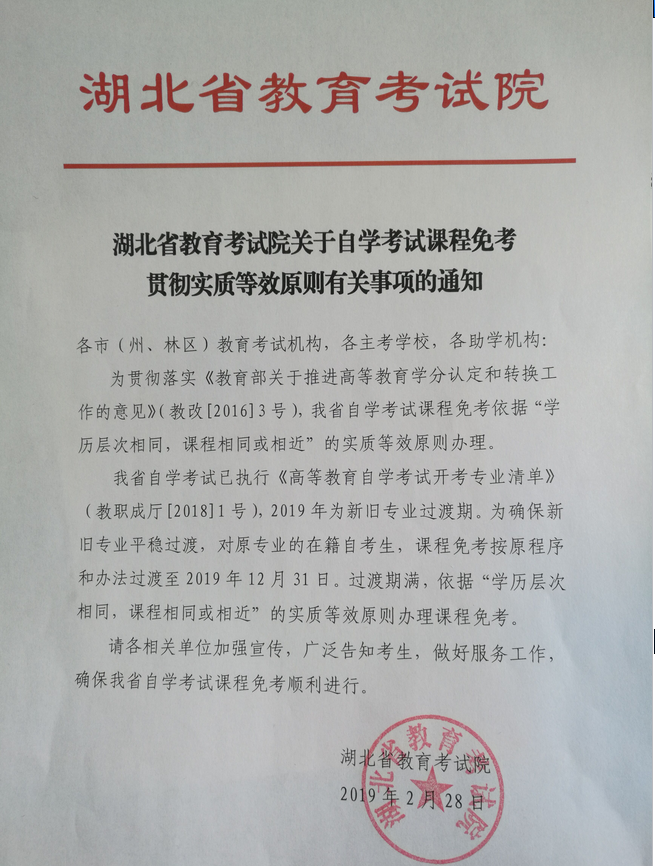 湖北省教育考试院关于自学考试课程免考贯彻实质等效原则有关事项的通知