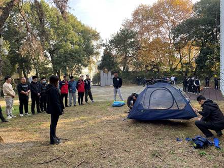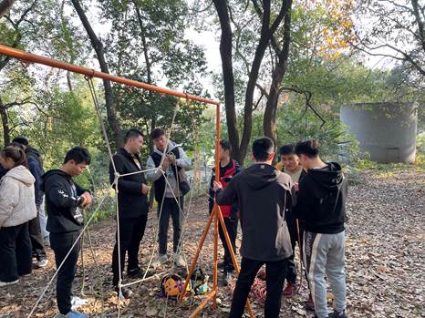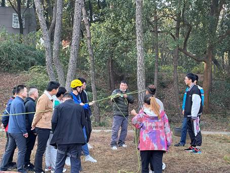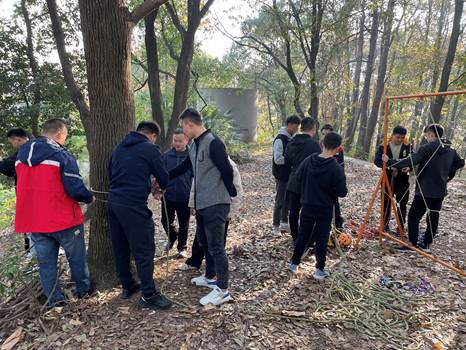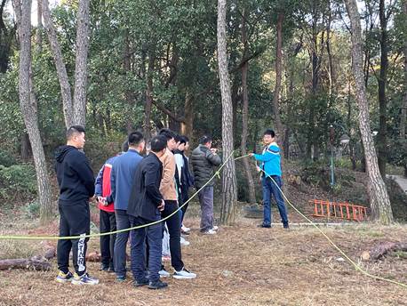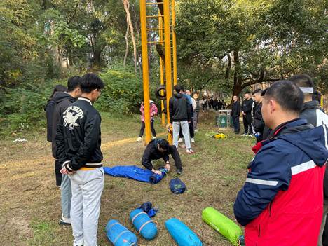 公司体育公司周云老师给全体学员讲述了野外工作可能遇到的突发情况,以及应对办法,并带领全体学员在公司户外生存训练基地进行实操训练。