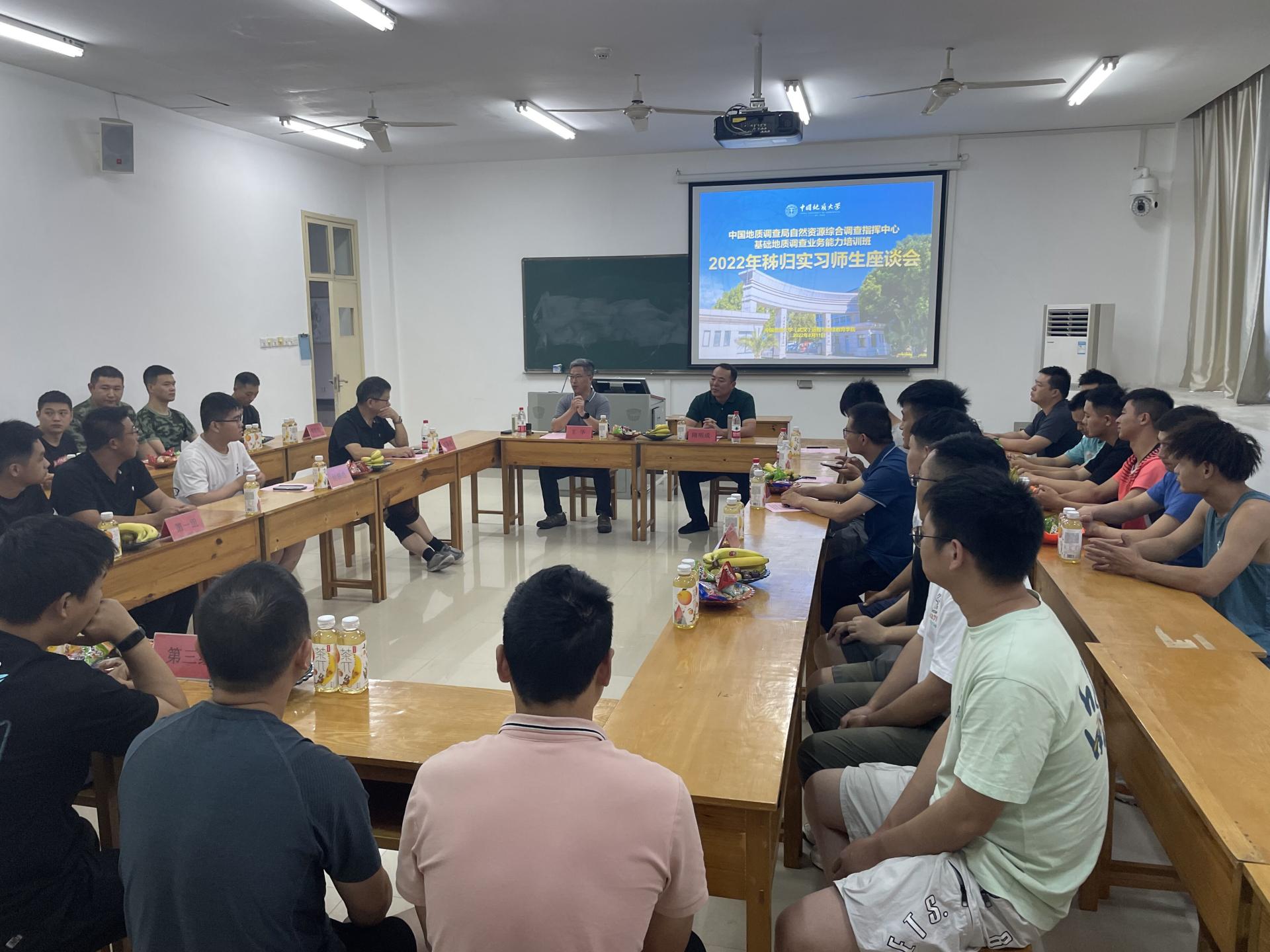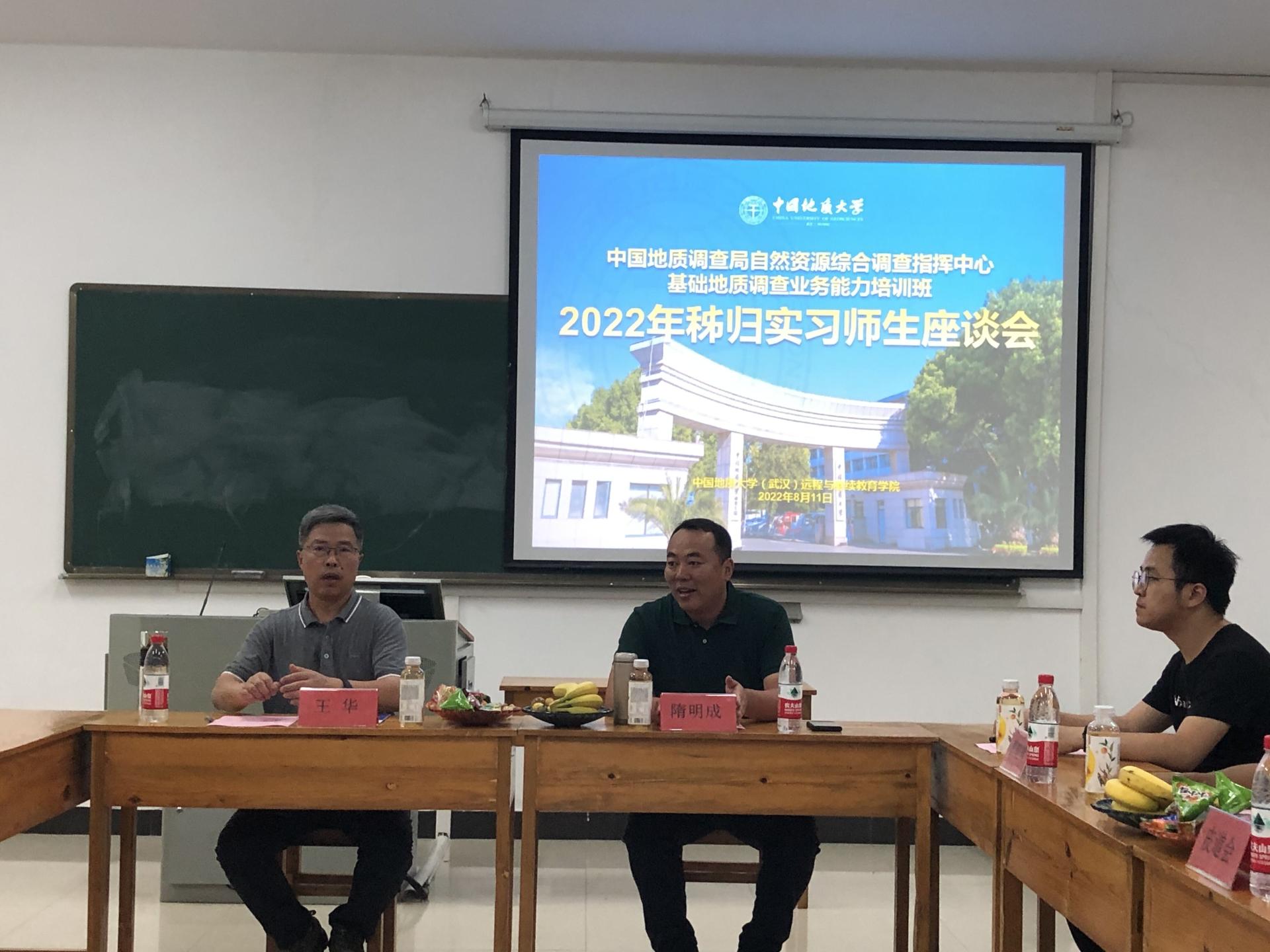 当天下午,王华一行与实习师生座谈。座谈会上,隋明成说明了此行的目的,表达了对实习师生的慰问与关怀;培训班带队实习老师曹晓峰、班主任皮道会分别介绍了本次实习情况及相关工作安排;汪新庆老师介绍了数字填图课程的授课情况及课程要求;助教付栋良分享了开展实习工作的感受与思考;员工代表畅谈了对本次实习的感受和体会,并提出了意见与建议。