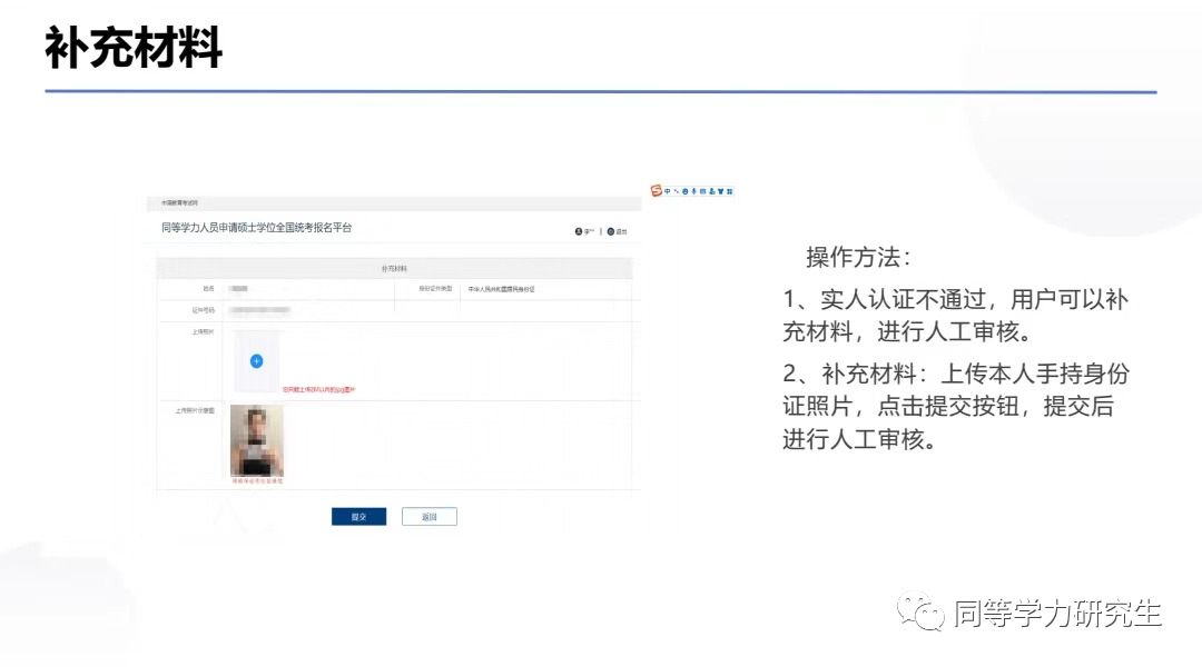 如果出现实人认证不通过的情况,用户可以提交补充材料,进行人工审核。补充材料:本人手持身份证的照片,上传成功后点击提交按钮,提交后将进行人工审核。