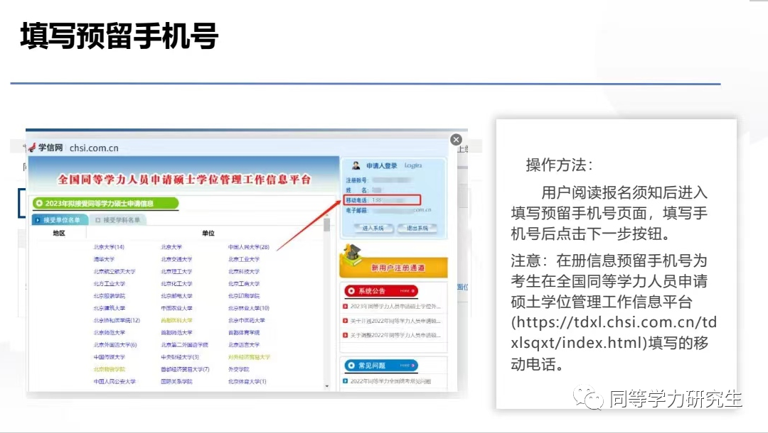 注意:在册信息预留的手机号为考生在全国同等学力人员申请硕士学位管理工作信息平台(https://tdxl.chsi.com.cn/tdxlsqxt/index.html)所填写的移动电话。