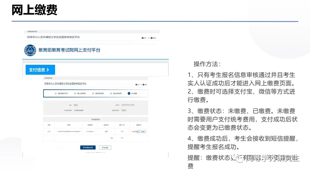 只有提交了报名信息并通过实人认证后,才能进行缴费操作,缴费成功后考生会收到短信提醒。