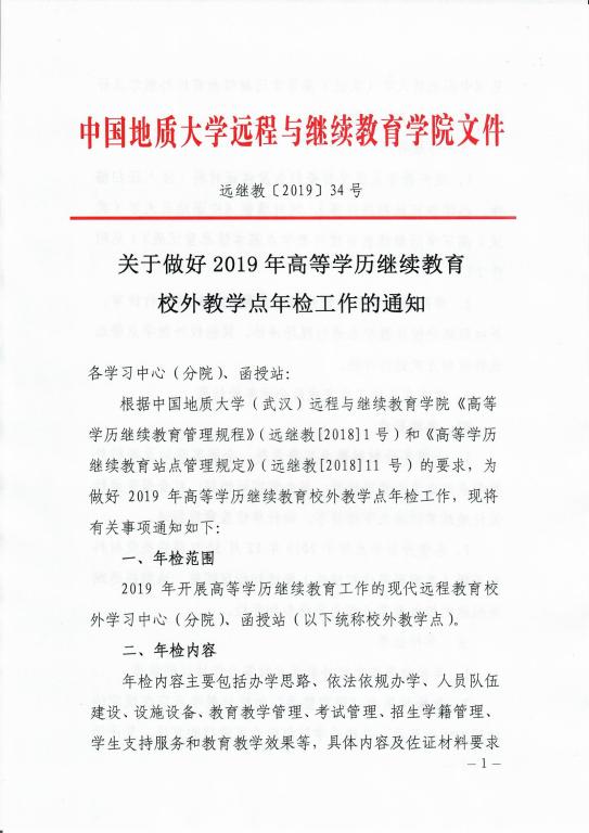 《关于做好2019年高等学历继续教育校外教学点年检工作的通知》(远继教〔2019〕34号)