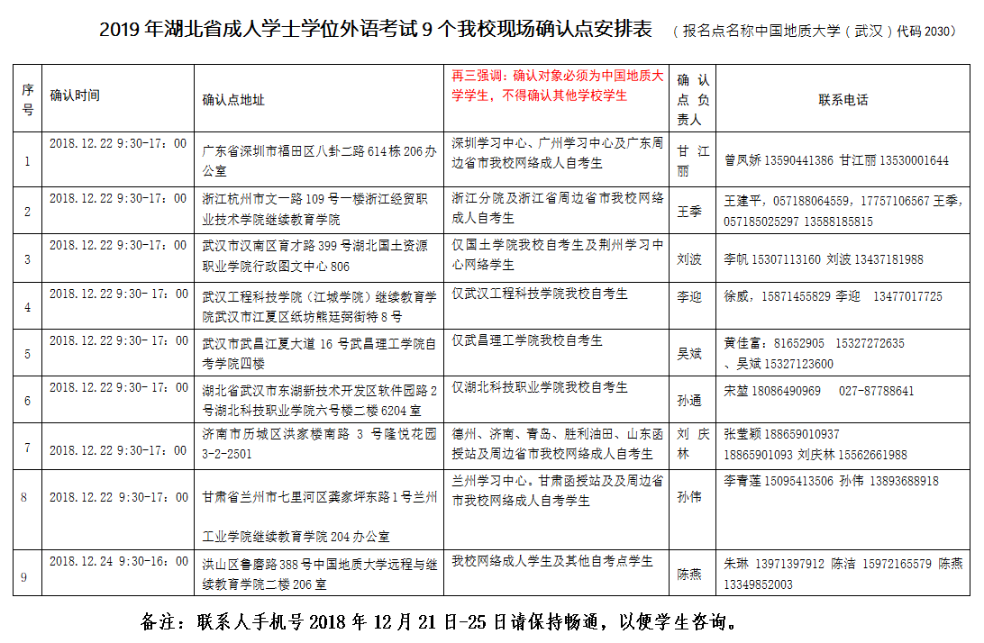 附件:2019年中国地质大学成人学士学位外语考试现场确认安排表
