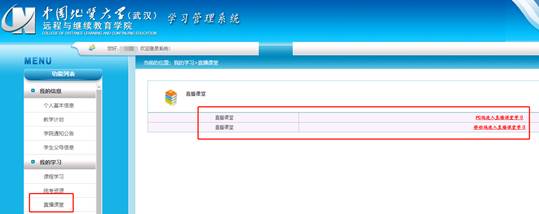 1.登录“学习管理系统”, 在左侧功能列表内点击“直播课堂”。