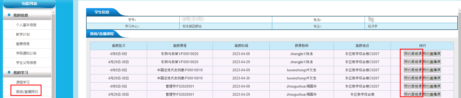 1.登录“学习管理系统”,在左侧功能列表内点击“面授/直播预约”。