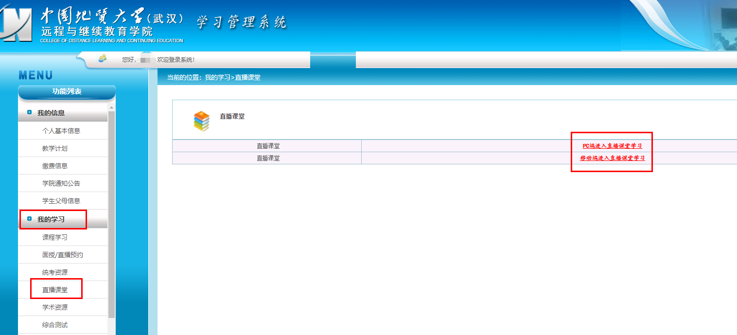 (2)手机登陆方式:打开手机浏览器,搜索“中国地质大学Beats365唯一官网入口”,点击“员工入口”登陆学习管理系统,选择“直播课堂”,点击“进入直播课堂学习”。