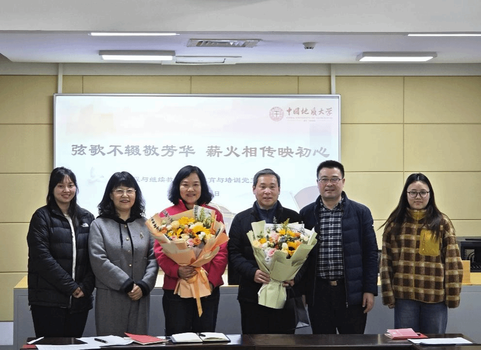 随后,支部最年轻的两位老师——王乐佳、刘依博涵,为吕国斌、朱琳献上鲜花和纪念品,表达对他们的敬意和美好祝福。