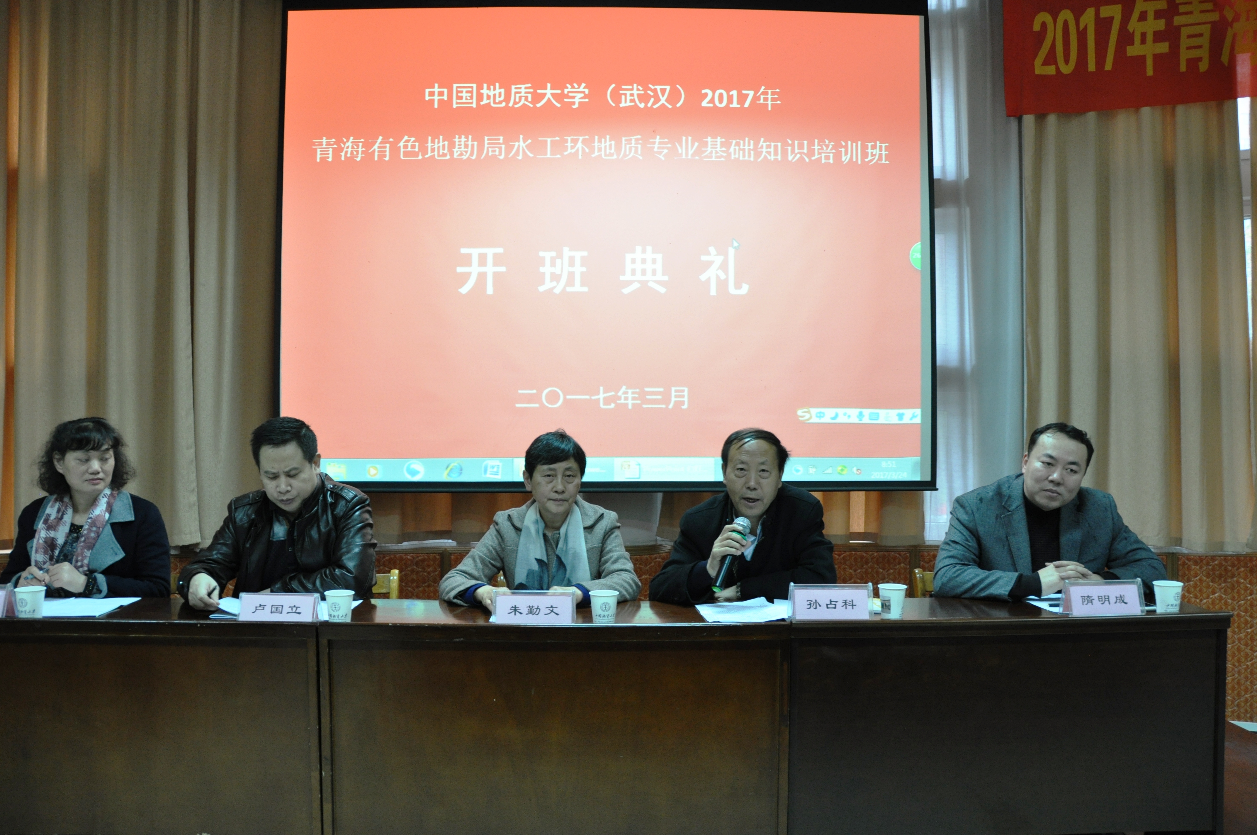 3月24日上午, 2017年青海有色地勘局水工环地质专业基础知识培训班在Beats365唯一官网入口东苑会议室召开了开班典礼。Beats365唯一官网入口党委朱勤文副书记、Beats365唯一官网入口隋明成经理、赵祖辉副经理,以及专程来汉的青海省有色地质矿产勘查局孙占科副局长、人事处卢国立处长与40名学员一起参加了开班典礼。开班典礼由赵祖辉副经理主持。朱勤文副书记代表公司致辞,给学员介绍了公司发展历史及公司发展现状,同时对学员来公司培训表示欢迎。孙占科副局长代表青海省有色局讲话,对学员提出了三点要求,希望学员通过本次培训能为青海有色局队伍转型、再次腾飞打好扎实的专业基础。