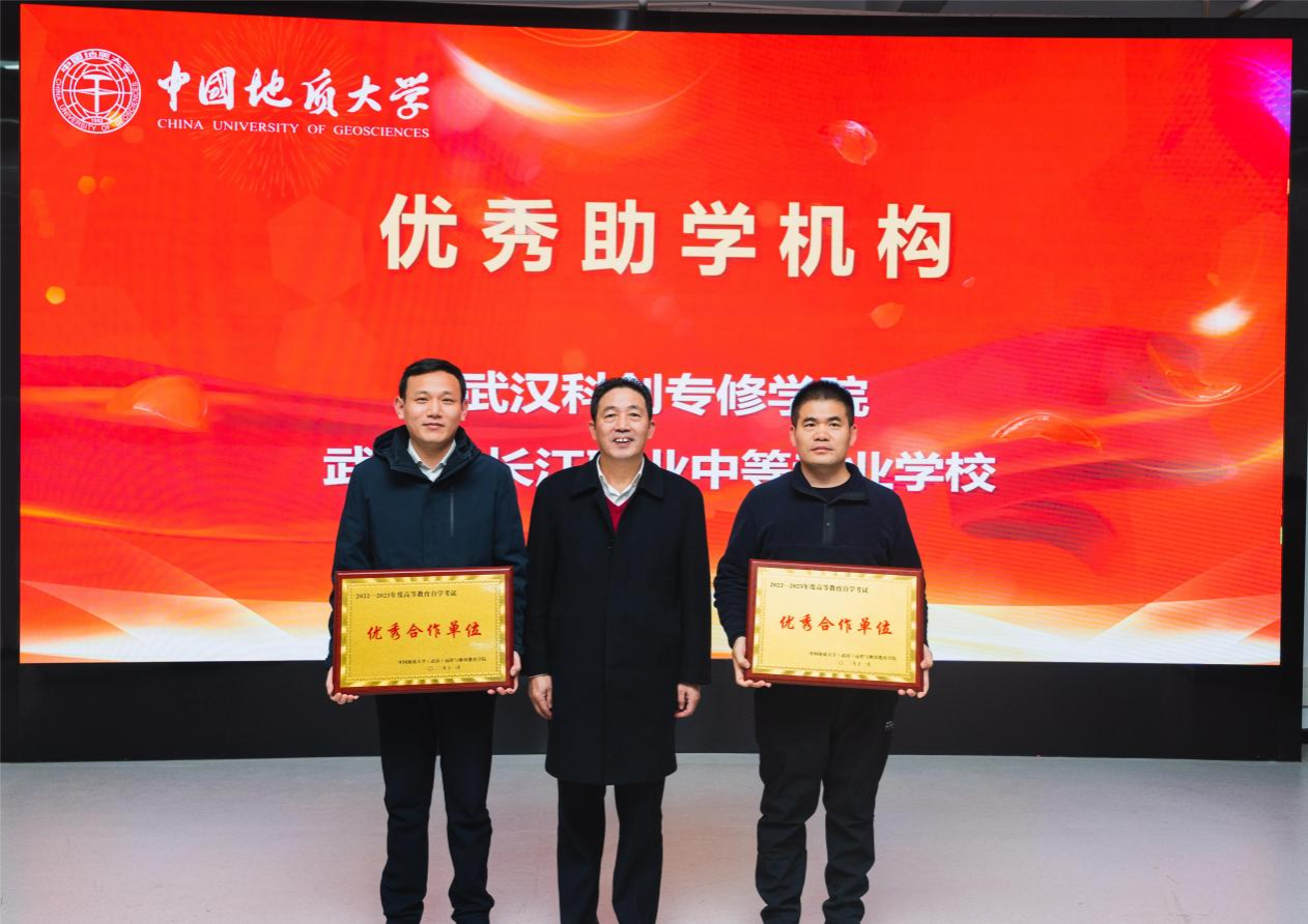 隋明成宣读了《关于公布2022-2023年度高等教育自学考试助学机构年检结果的通知》,参会领导向优秀助学单位和突出贡献单位授牌。