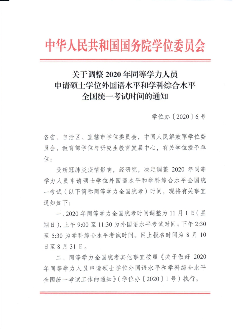 关于调整2020年同等学力人员申请硕士学位外国语水平和学科综合水平全国统一考试时间的通知