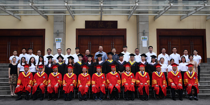 集团副董事长赖旭龙教授为12位获得学士学位的学员逐一“拨帽穗”和颁发学位证书,为20位毕业生颁发毕业证书,并与他们一一合影留念。