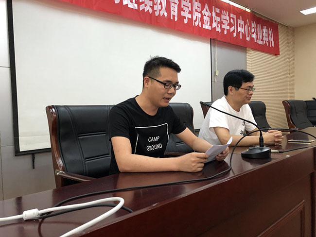 毕业生代表周磊同学代表全体毕业生,感谢学习中心为他们提供了一个良好的学习平台,感谢老师给予了他们真诚的服务,感谢同窗们的互帮互助。他表示今后无论在什么工作岗位,一定带着在金坛学习中心这几年的学习成果,扎实工作,学以致用,争取在工作中取得更大的成就。