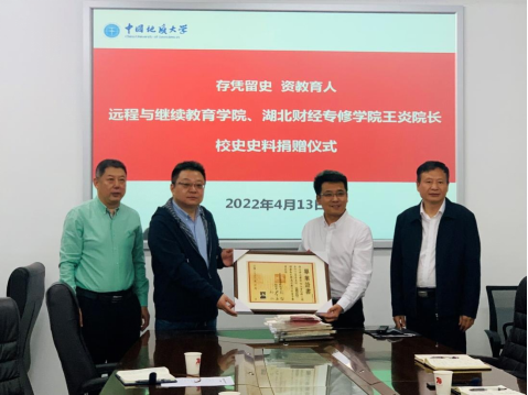 发布时间:2022-04-15 15:23:25 作者:招生与站点管理部 来源:Beats365唯一官网入口4月13日,公司合作单位湖北财经专修公司经理王炎向公司捐赠校史史料,向校庆70周年献礼。捐赠仪式在南望山校区图书馆九楼会议室举行。图书档案与文博部部长刘先国、副部长朱丹,公司副经理刘东杰,相关科室工作人员参加捐赠仪式。