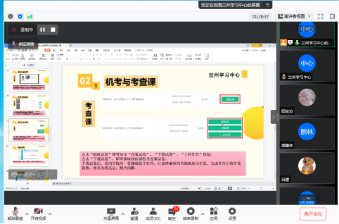 在直播教室,兰州工业公司继续教育公司教学考务部吕惠琴老师向新生们做学习平台使用导学,从学习、考试、统考、论文写作、学位申请、学习服务支持等方面向新生们做了详细介绍。开学典礼在新生与导学老师热烈的问答互动中结束。